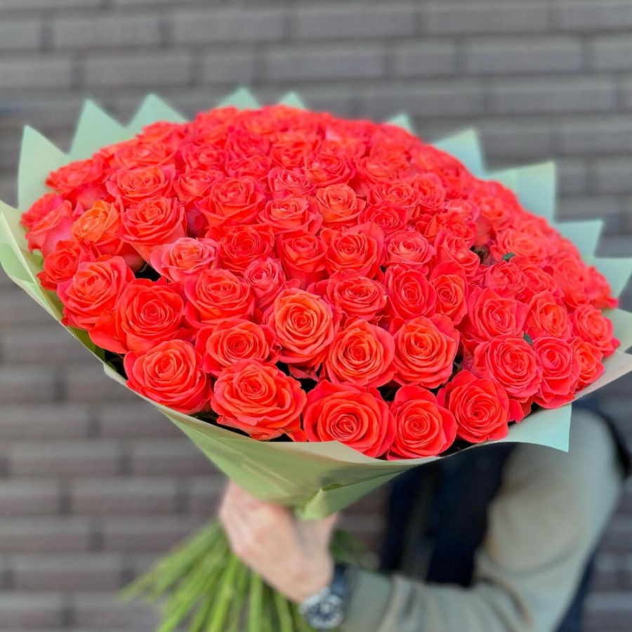 На фото букет из 101 коралловой розы. В составе: роза 101 шт, дизайнерская упаковка 2 шт, атласная лента 1 шт, . Все цветы свежие и ароматные, букет красиво оформлен и отлично подходит для подарка. Доступна доставка цветов или самовывоз.